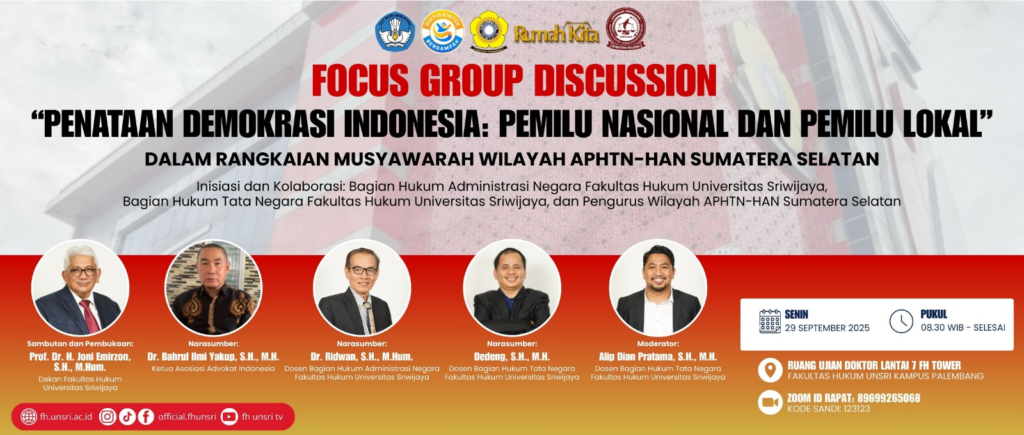 LPM MEDIA SRIWIJAYA – Palembang, 29 September 2025 – Bagian Hukum Tata Negara Fakultas Hukum Universitas Sriwijaya bersama Bagian Hukum Administrasi Negara serta Pengurus Wilayah Asosiasi Pengajar Hukum Tata Negara dan Hukum Administrasi Negara (APHTN-HAN) Sumatera Selatan sukses menyelenggarakan Focus Group Discussion (FGD) bertajuk “Penataan Demokrasi Indonesia: Pemilu Nasional dan Pemilu Lokal”. Kegiatan ini dilaksanakan pada Senin, 29 September 2025, bertempat di Ruang Ujian Doktor Ilmu Hukum Lantai 7 FH Tower Universitas Sriwijaya, Kampus Palembang, mulai pukul 08.30 WIB hingga selesai.