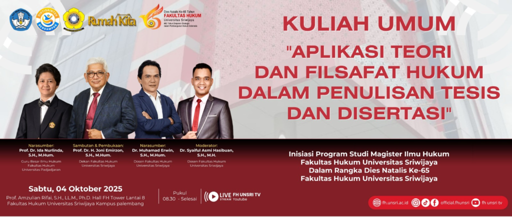 LPM MEDIA SRIWIJAYA – Palembang, 4 Oktober 2025, Program Studi Magister Ilmu Hukum Fakultas Hukum Universitas Sriwijaya sukses menyelenggarakan Kuliah Umum bertajuk “Aplikasi Teori dan Filsafat Hukum dalam Penulisan Tesis dan Disertasi” pada Sabtu, 4 Oktober 2025. Kegiatan ini menjadi bagian dari rangkaian Dies Natalis ke-65 Fakultas Hukum Universitas Sriwijaya, yang digelar di Prof. Amzulian Rifai, S.H., LL.M., Ph.D. Hall, lantai 8 FH Tower, Kampus Palembang.