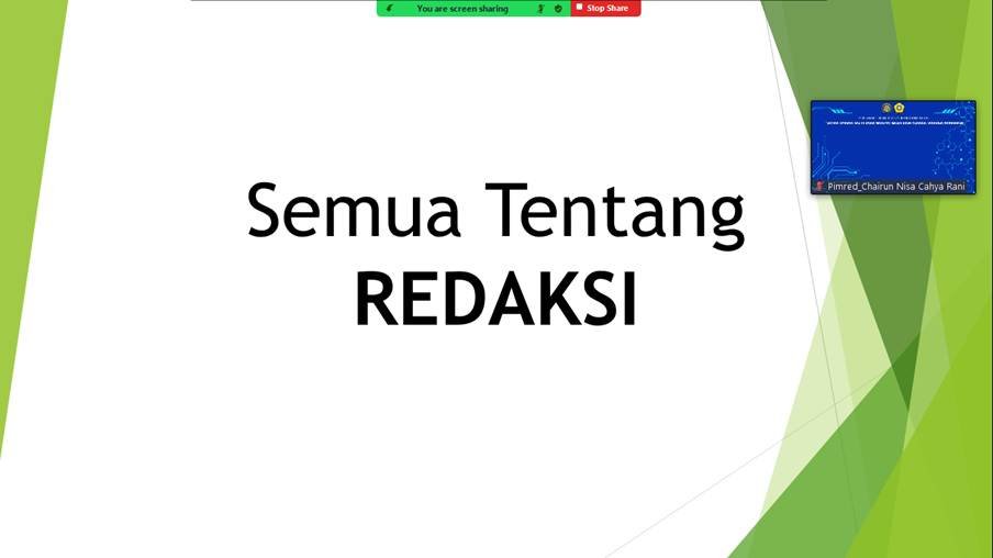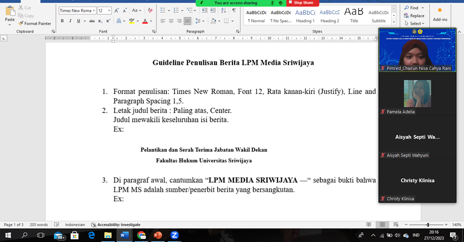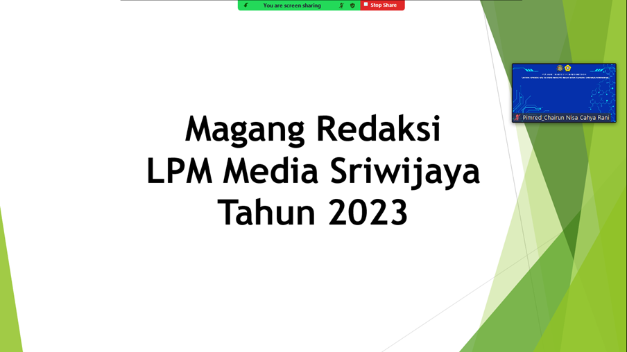LPM MEDIA SRIWIJAYA – Setelah sukses mengadakan Pelatihan Jurnalistik Tingkat Dasar (PJTD), LPM Media Sriwijaya kembali menyelenggarakan agenda tahunan, yakni kegiatan permagangan bagi calon anggota LPM MS. Kegiatan permagangan ini merupakan kegiatan yang diperuntukkan bagi CLPM agar mereka dapat menentukan divisi mana yang cocok/sesuai dengan minat dan bakat mereka. Kegiatan tersebut dibagi menjadi tiga sesi, menyesuaikan jumlah dari divisi yang ada di LPM MS, yakni Divisi Redaksi, ICT dan PPSDM. Kegiatan permagangan pertama dibuka oleh Divisi Redaksi dan diadakan pada Rabu, 27 Desember 2023 Pukul 19.30 WIB. Kegiatan yang berlangsung secara daring lewat ruangan Zoom Clouds Meeting tersebut menghadirkan Pimpinan Redaksi, Badan Pengurus Harian (BPH), dan anggota CLPM.